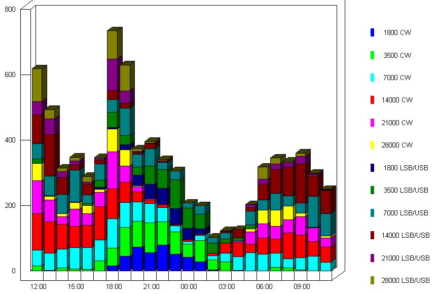 QSO skaita statistika pa stundām, diapazoniem, darba veidiem: