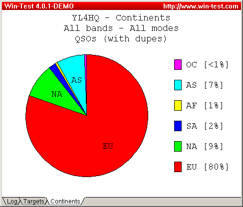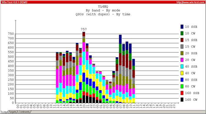 QSO skaita statistika pa stundām, diapazoniem, darba veidiem: