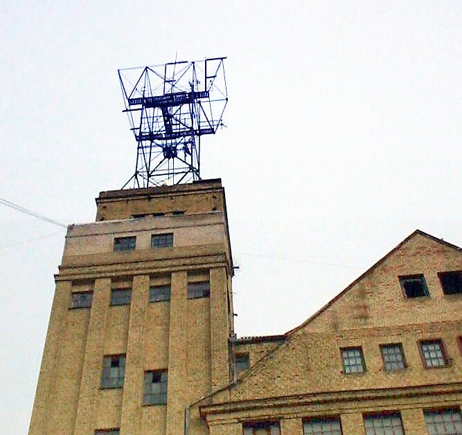 Приемно-передающая вертикальная антенна которую изготовил Вилис Сиекстыньш, YL3GDF, установлена на башне завода VEF по