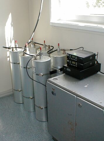Шесть больших цилиндров слева - объемные резонаторы для частотной развязки приемника и передатчика (дуплексер).