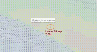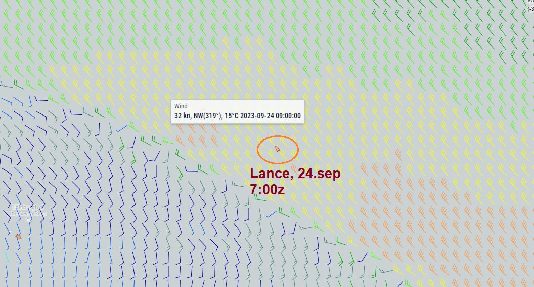 Evening update: In the evening Yuris wrote short message confirming the potential delay - ship captain's latest forecast for reaching ZD9 is September 26th, subject to change depending on the actual weather conditions. Lance's location at 20:00 UTC, September 19, 2023.
