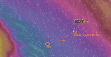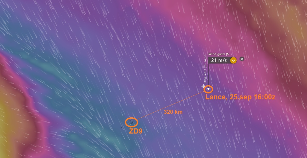25.sep 19:00z: MFV Lance is currently inside another storm. According to the weather forecast storm might subside by midday September 26. About 300 km left to the destination.