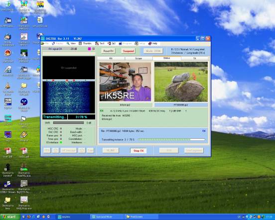 Pēc brīža DIGTRX programma informē, ka nāk fails no IK5GQG un vēl pēc brīža parādās bildīte. Tas ir izdevies, ir kontakts ar IK5GQG un no pārsteiguma viņš nepaspēja atrast neko labāku, kā šīs krāsu testa svītras fonā.